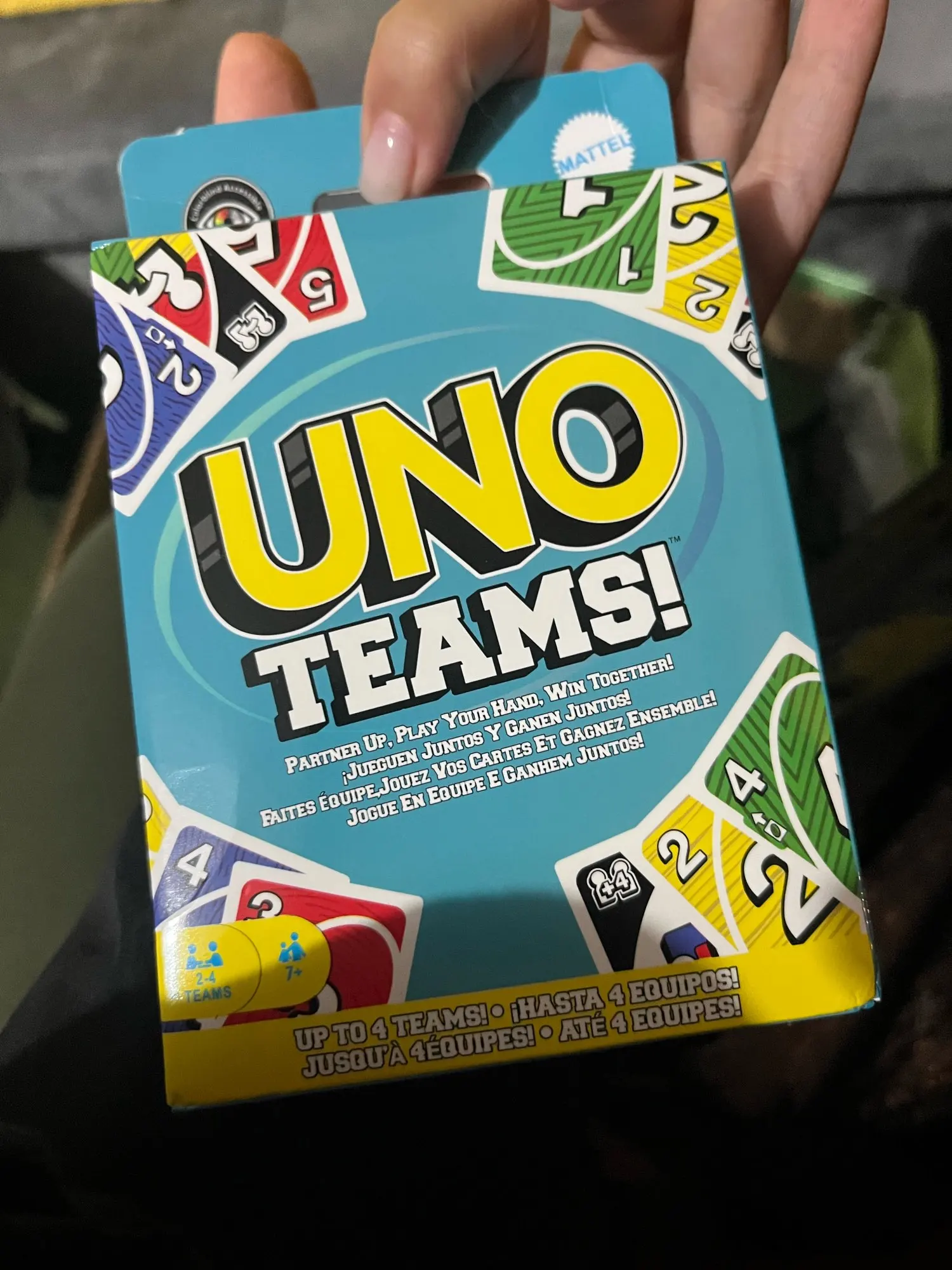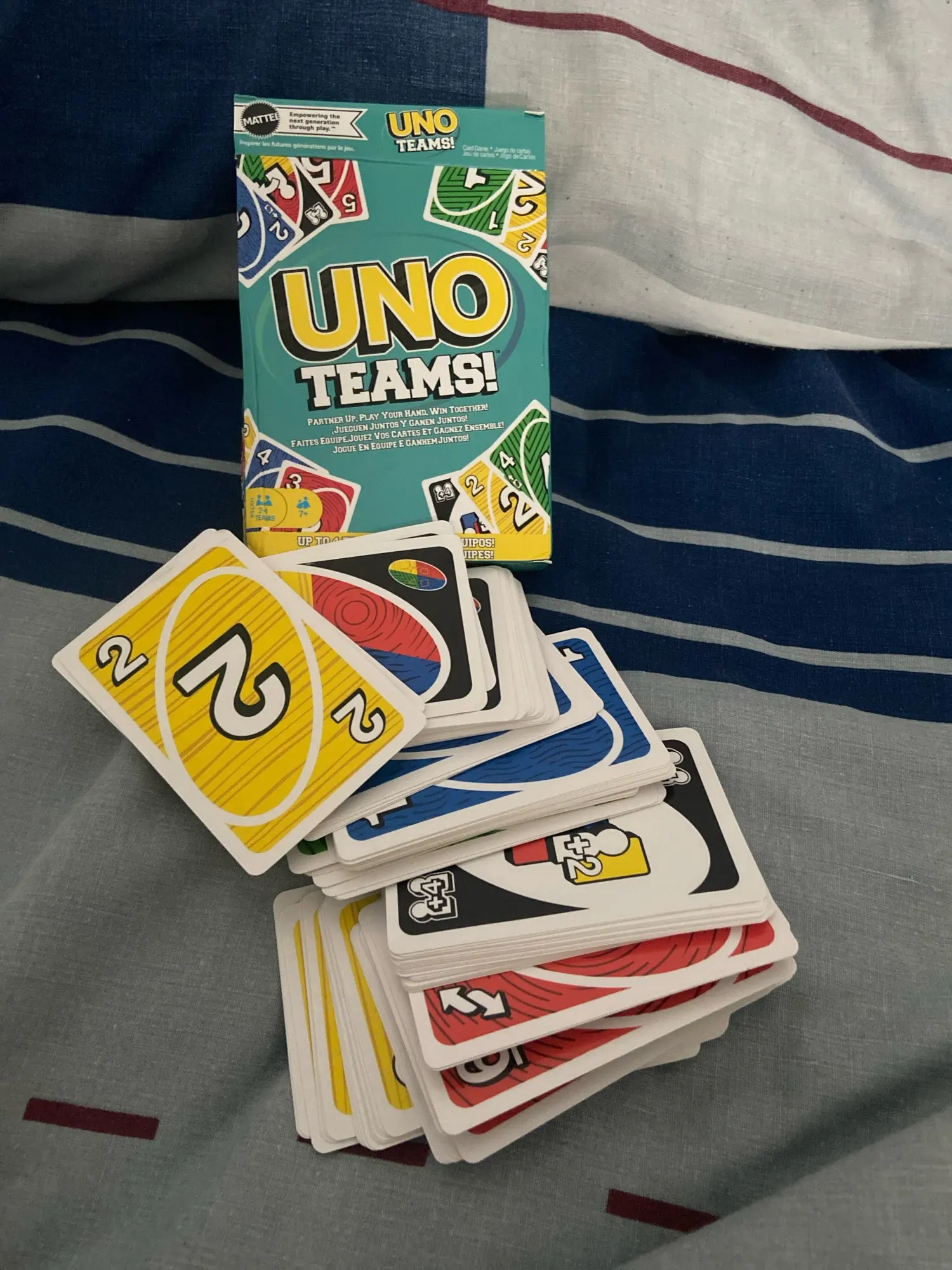 Tal cual la foto. Típico juego de cartas UNO, pero esta vez es de equipos.